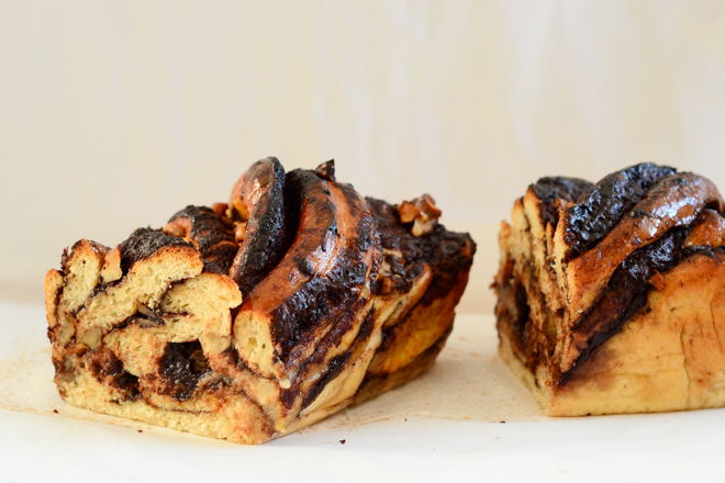 Voiam de mult să încerc să fac şi eu acasă. Îmi plac foarte mult aluaturile pufoase şi dulci, mai mult decât prăjiturile clasice. Nu am apucat însă să lucrez mult cu ele până acum. Reţeta de mai jos e o combinaţie de două reţete – un aluat simplu ca de brioche dintr-o carte cu reţete de bază iar umplutura de ciocolată e din cartea lui Ottolenghi, Ierusalim, pagina 284. Chiar are o reţetă de Babka.