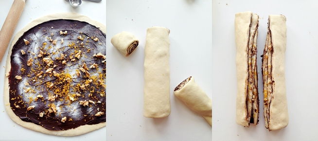 Pe o suprafaţă uşor înfăinată şi cu un făcăleţ înfăinat, rulăm aluatul de Babka. Trebuie să fie în formă de dreptunghi. Ca să obţinem această formă putem tăia cu un cuţit marginile ca să fie drepte. Eu am sărit peste pasul ăsta. Întindem pasta de ciocolată cu o lingură şi lăsăm un pic din margine goală. Presărăm nucile, zahărul şi coaja de portocală. Punem un pic de apă pe margini. Rulăm aluatul ca pe o ruladă.