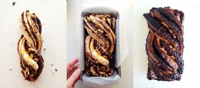 Presăm capătul din stângă sus ca să îl lipim şi îl ridicăm peste fâşia din dreapta. Apoi ridicăm dreapta peste stânga. Facem două împletituri. Presăm capetele ca să le lipim uşor. Avem Babka. Foarte uşor, ridicăm aluatul şi îl punem în formă. Forma de chec o ungem cu unt şi o tapetăm cu hârtie de copt înainte. Nu vă faceţi prea multe griji legate de formă sau de cum arată Babka. Are oricum o formă mai ciudată datorită împletiturii şi faptul că aluatul e tăiat anterior. Mie îmi place pentru că astfel se vede umplutura.