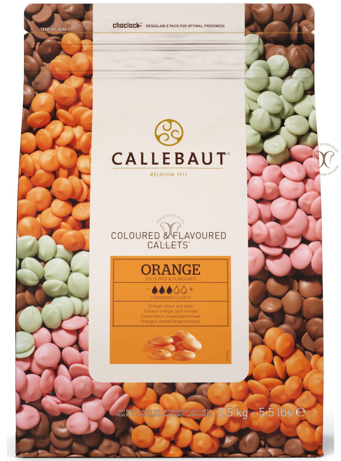 Traieste viata in culori! Iata o ciocolata grozava pentru a semna creatiile tale cu o surpriza de culoare si aroma. Orange Callets Ø„¢, realizate cu ciocolata alba CallebautØ® Belgiana, combina un gust dulce si cremos cu gustul dulce-amarui de portocala.