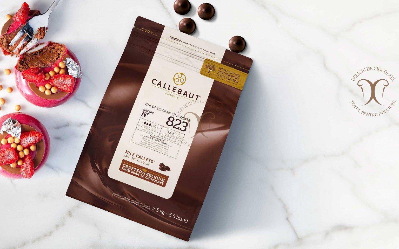Reteta de ciocolata din lapte nr. 823 este ciocolata cu lapte iconica a lui CallebautØ®. Se remarca prin culoarea sa profunda, calda, aromele proaspete de cacao prajita si notele de caramel seducatoare. Modelul 823 este apreciat pe scara larga datorita gustului sau generos si a reputatiei excelente in folosire. Poate fi asociata cu o gama larga de arome puternice de fructe, picante, lactate sau lichioruri. Miezul ciocolatei este semnatura amestecului de cacao Wieze: un amestec secret bine pastrat, alcatuit in special din boabele de cacao de cea mai buna calitate din Africa de Vest.