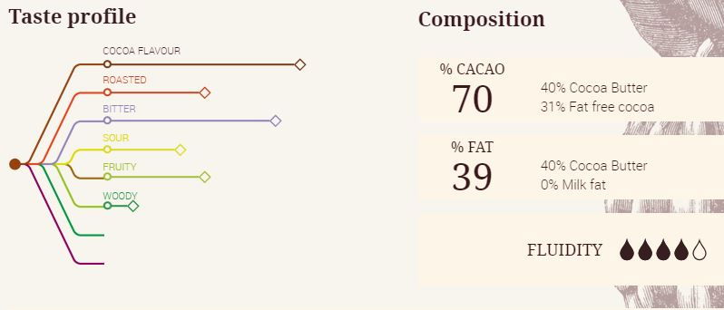 Produsa din boabe de cacao din regiunea Ivory, varietatea Forastero, prin procesul inovativ Q-fermentation, aceasta este o ciocolata neagra dinstinctiva cu un gust placut de cacao si un stop de aciditate.