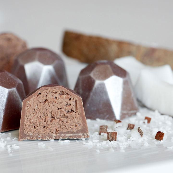 Aceast pralin este o pasta fina de ciocolata cu lapte si fulgi de nunca de cocos si Delicrisp crocant cu unt.