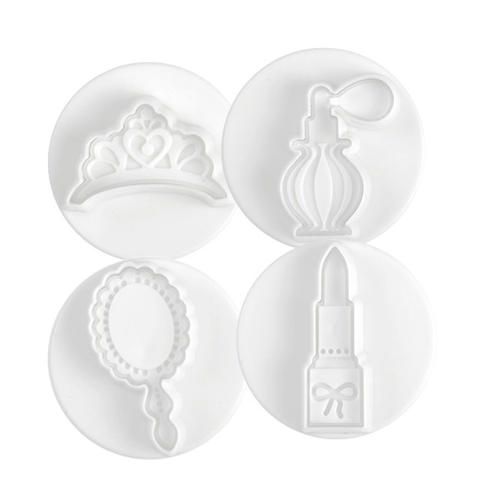 Set 4 decupatoare cu extractor, din material plastic. Pentru realizarea decorurilor din pasta de zahar sau fondant.