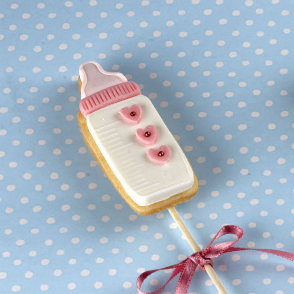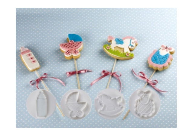 Setul contine 4 modele decupatoare: bavetica, carucior, jucarie-calut si biberon.