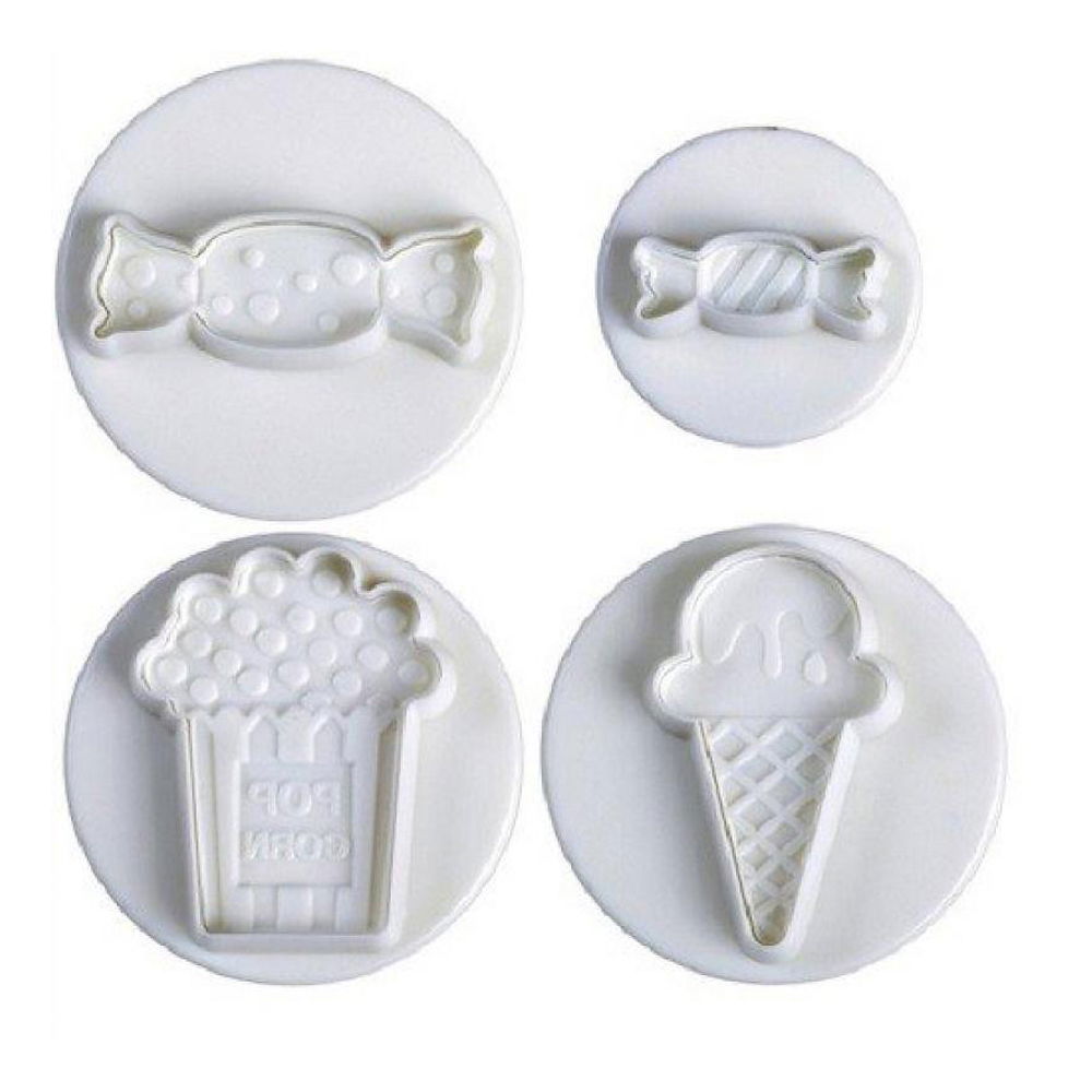 Set 4 decupatoare cu extractor, din material plastic. Pentru realizarea biscuitilor si decorurilor din pasta de zahar sau fondant.