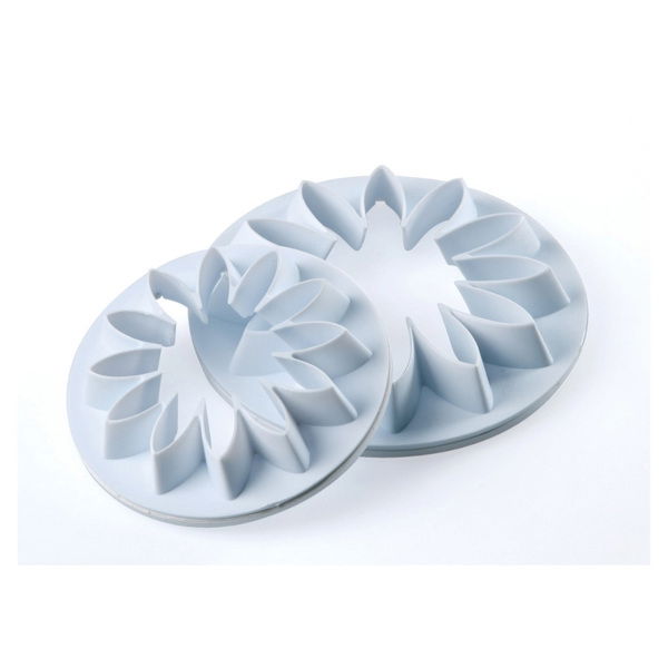 The package contains a set of two individual food-grade plastic cutters in different sizes (7 cm and 9 cm), designed to create layered flowers.