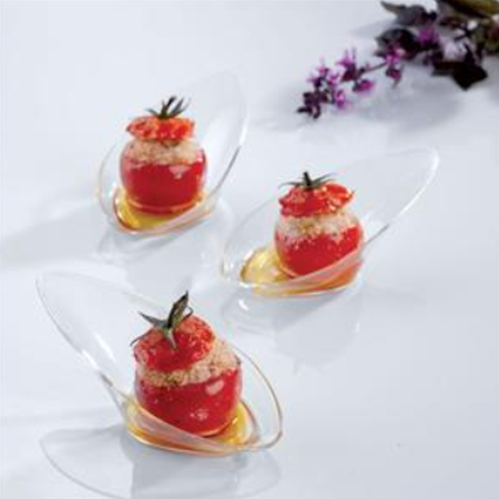 Set Farfuriute, model Virgula, din material plastic alimentar, pentru expunerea diverselor produse mici, dulci sau sarate, in cazul organizarii unui Bufet sau a unui Candy Bar.