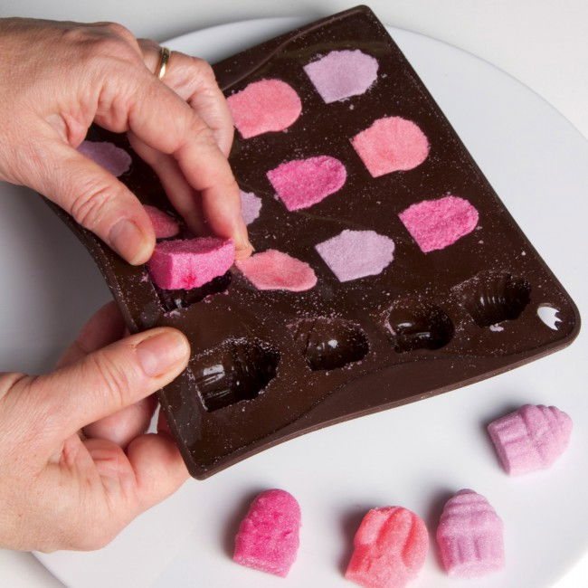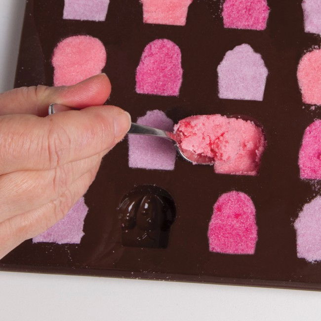Forma din silicon platinic alimentar pentru realizarea de: praline din ciocolata, decoruri din ciocolata, bomboane din jeleu, mousse-uri, aspic, minideserturi sau cuburi de gheata speciale pentru cocktail-uri.