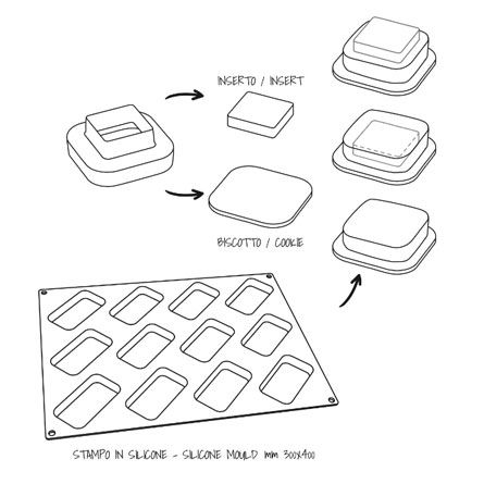 - cu ajutorul decupatorului se obtin atat baza desertului cat si insertia, ambele prin decuparea celor 2 forme, din aluat fraged sau biscuit;