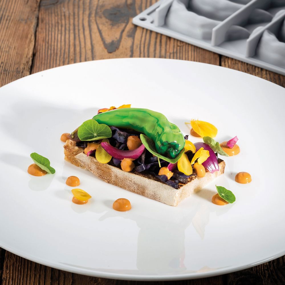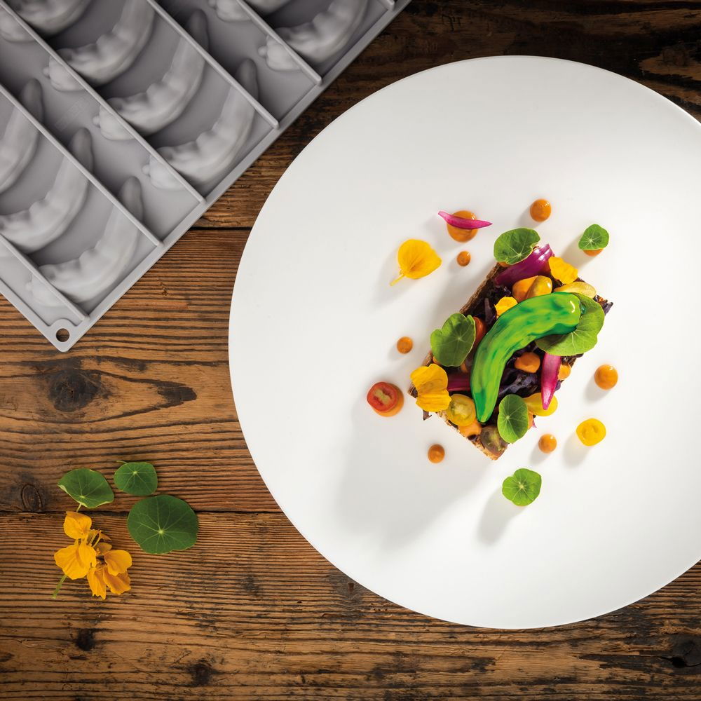 Formă din silicon alimentar, cu 12 cavități, pentru realizarea decorurilor sau a produselor de gastronomie moderne.