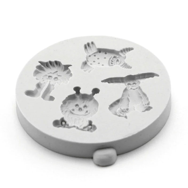 Cu ajutorul acestui mulaj obtineti, foarte rapid, 4 decoruri pentru Torturi, Cupcakes sau alte tipuri de produse destinate celor mici.