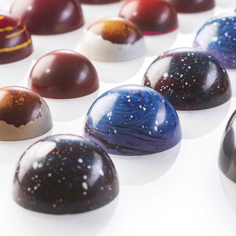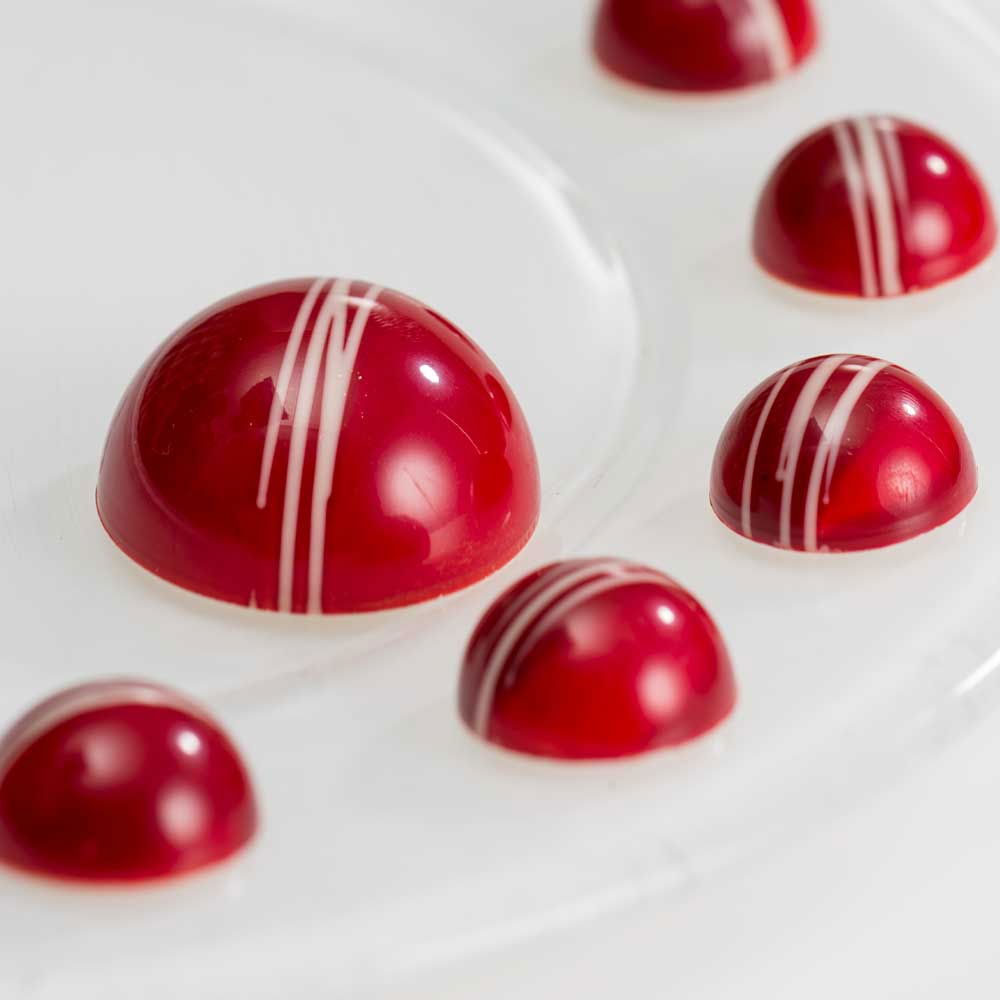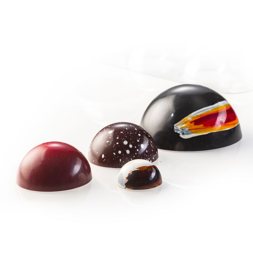 Kit compus din 4 matrite din material plastic rigid pentru realizarea de semisfere din ciocolata cu dimensiuni diferite.