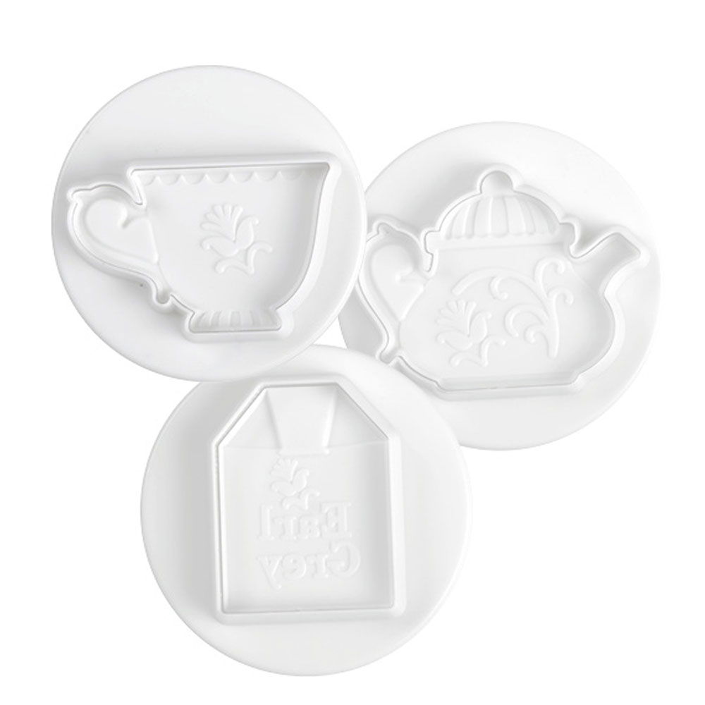 ContineØ 3 decupatoare in forme diferite: plic ceai, cescuta si ceainic.