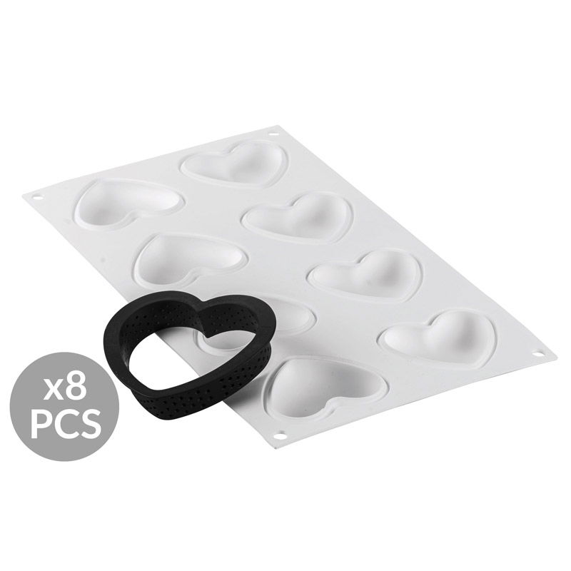 Set Tarte Inima acesta contine: 1 Forma Profesionala Silikomart, din Silicon alimentar si 8 rame din termoplastic pentru crearea bazei.