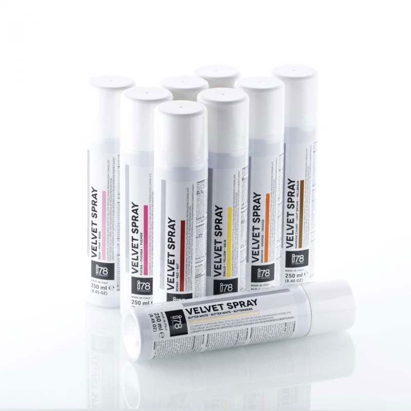 Colorant Alimentar, Spray Velvet gama i78, pe baza de unt de cacao, ideal pentru acoperirea produselor moderne de cofetarie.