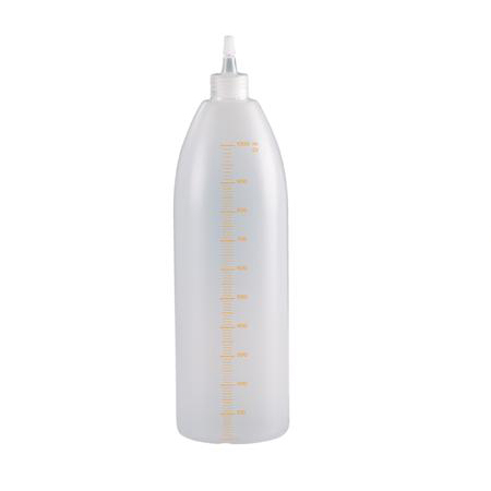 Sticla gradata, din material plastic alimentar semitransparent, cu capacel de inchidere cu filet.