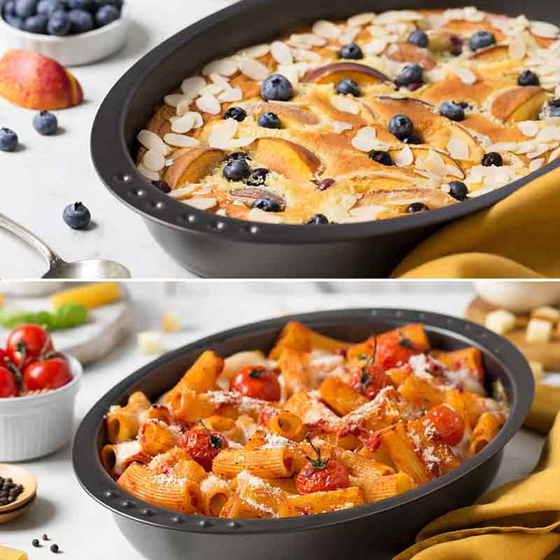 Tava coacere din aluminiu, prevazuta cu suprafata antiaderenta.