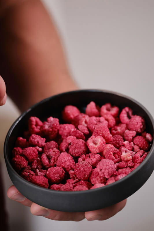 Zmeura liofilizata isi pastreaza aroma si nutrientii, dar are textura crocanta si se poate pastra mai mult timp.