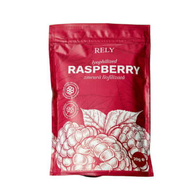 Zmeura liofilizata intreaga Rely, 20g, este obtinuta printr-un proces delicat de liofilizare (deshidratare prin congelare si vid), care pastreaza aroma intensa, culoarea naturala si nutrientii esentiali ai fructului proaspat.